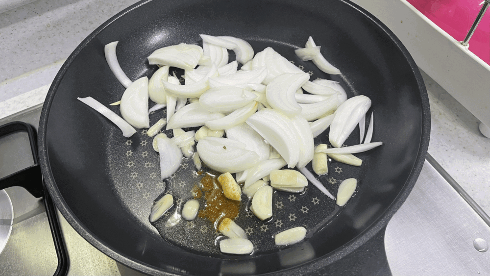 - 팬에 식용유를 두르고 생강가루, 마늘, 양파를 한 번에 넣고 중불에서 볶아주세요.