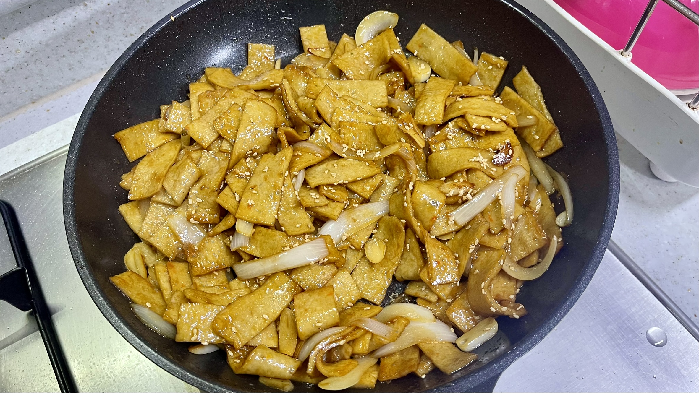 - 양파에 색이 나기 시작하면 오뎅을 넣고 데워질 정도로만 볶습니다.