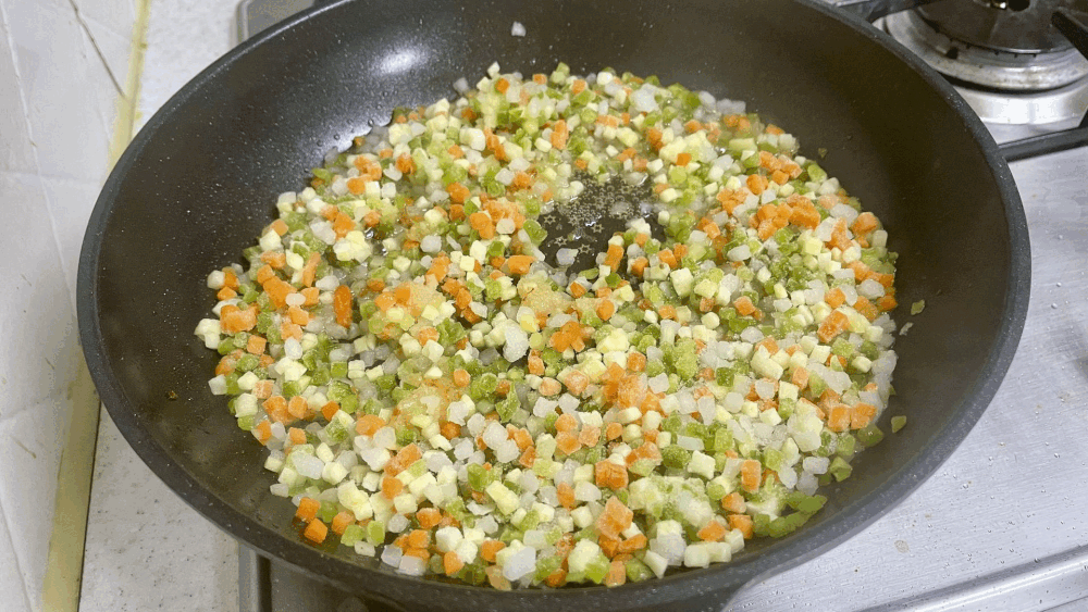 - 준비한 다진 야채 400g을 팬에 넣고 강불에서 수분이 날아갈 때까지 볶아줍니다.