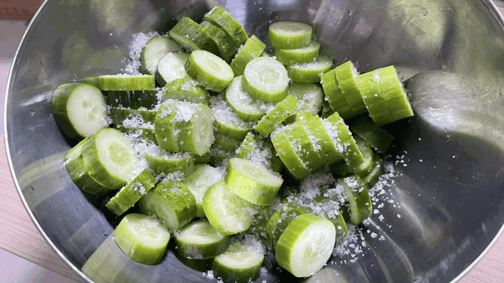오이를 0.5cm 두께의 반달 모양으로 썰어주세요. 소금 2큰술을 넣어 고루 섞은 뒤, 30분간 절입니다. 10분 간격으로 오이를 뒤집어주면 전체적으로 고루 절여져 더욱 맛이 좋아집니다.
