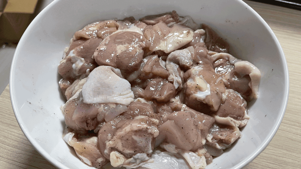 닭고기는 한입 크기로 자른 뒤, 소금 0.5작은술, 후추 0.5작은술, 맛술 2큰술을 넣고 10분간 재워주세요. 닭고기의 잡내를 없애고 부드러운 식감을 살리는 단계입니다. - 양념 만들기